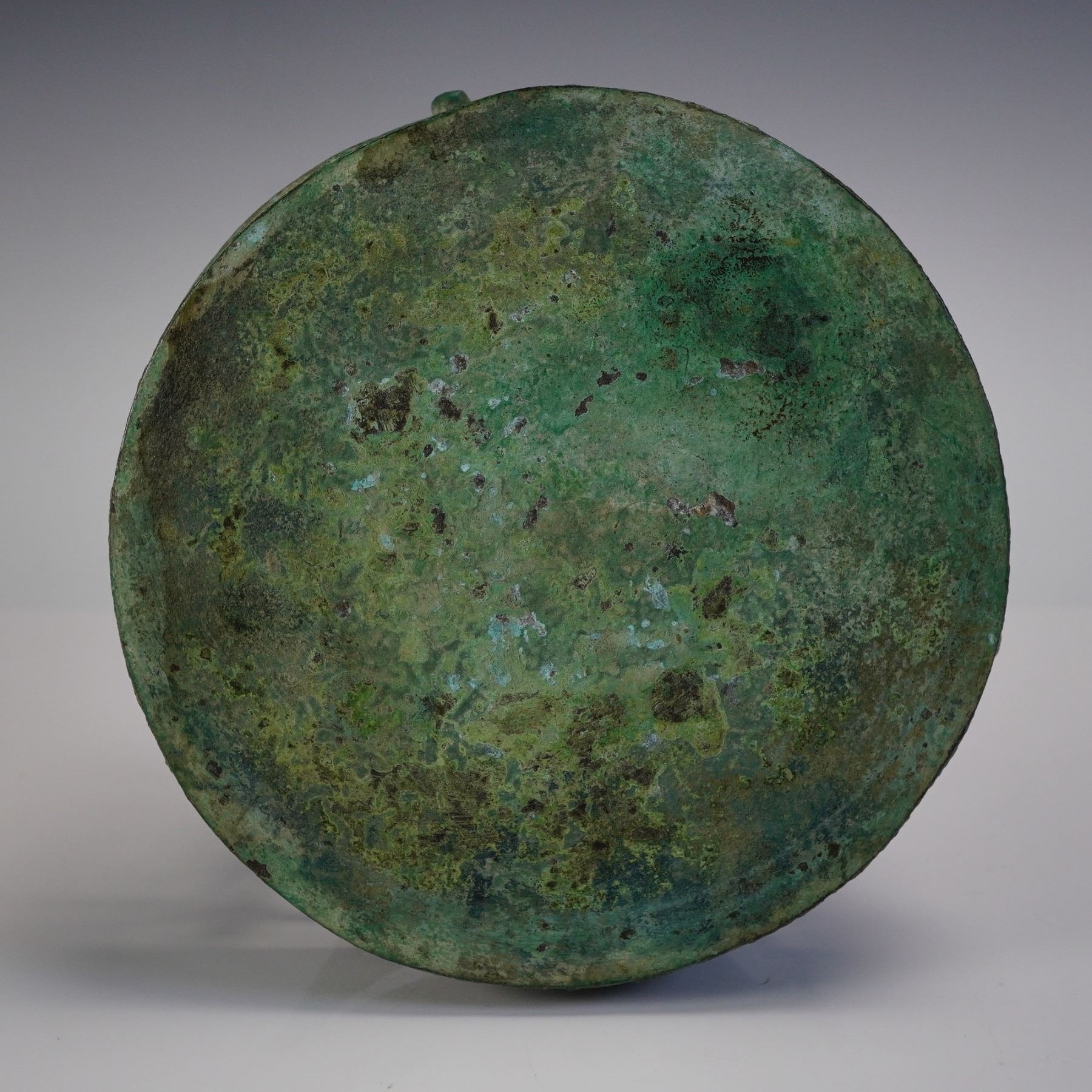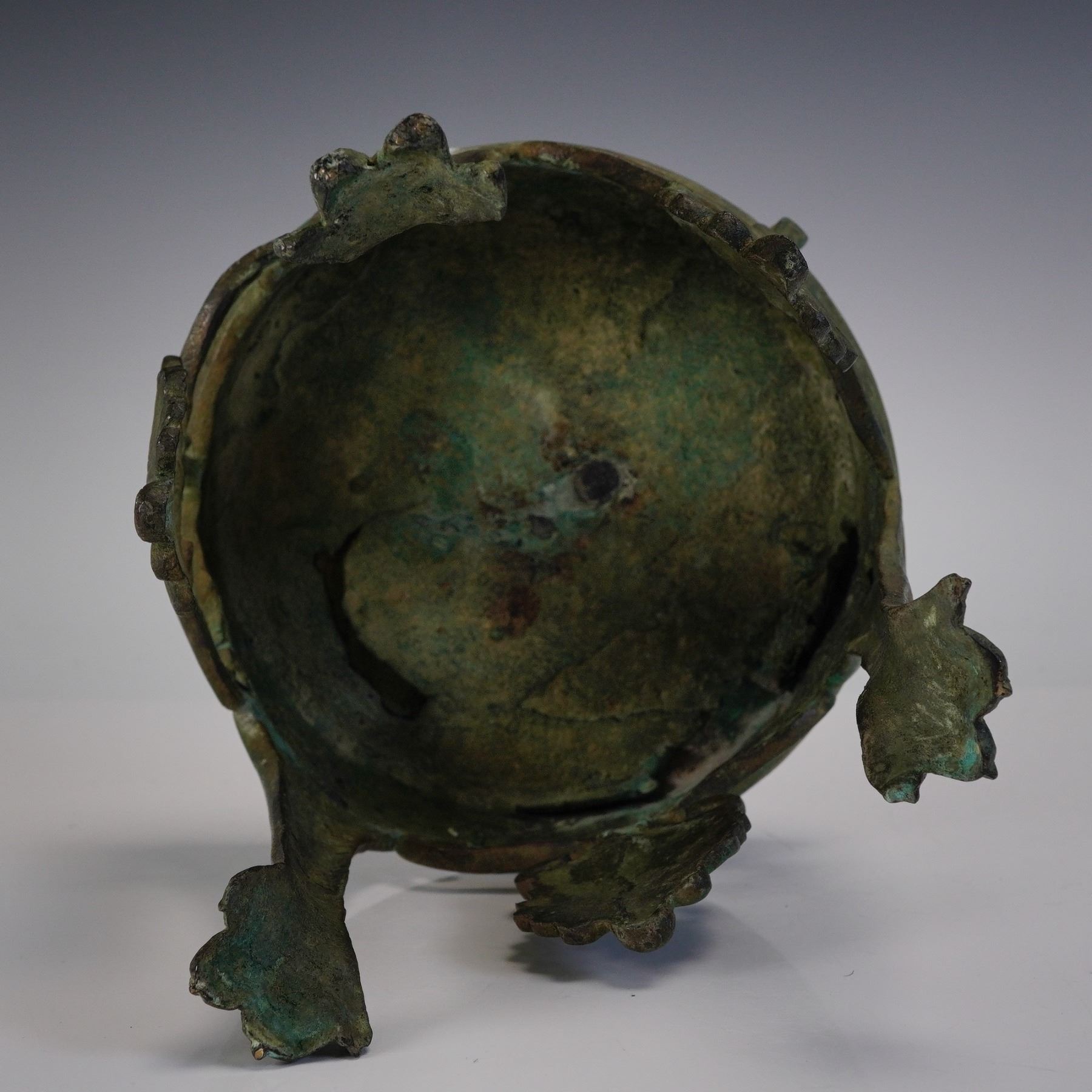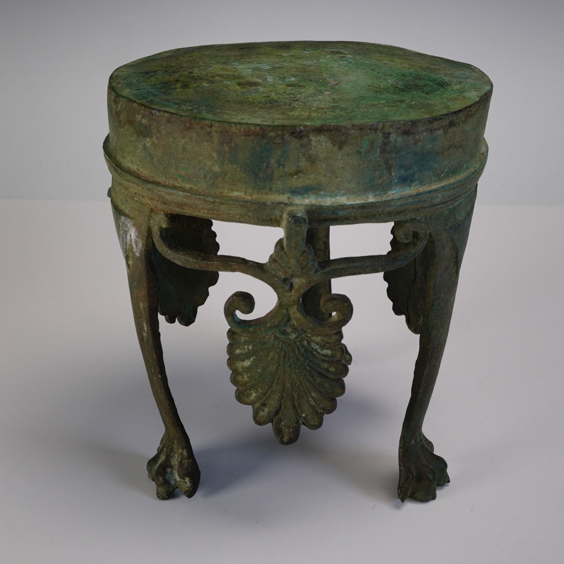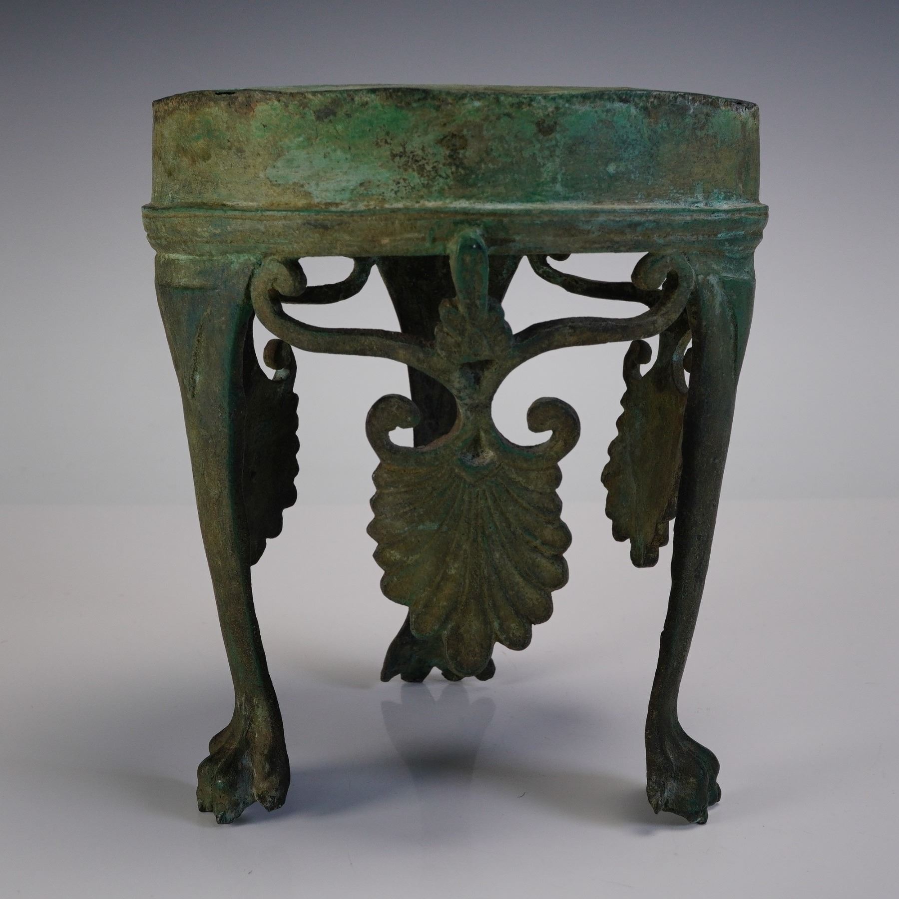 Greek Bronze Lotus Stand, possibly from "The Grand Tour Greek" tradition. Cast in bronze, the stand rests on three legs terminating in clawed feet. Each leg is adorned with a central scroll motif supporting a downward-facing lotus leaf form, with additional decorative leaves suspended between the legs. The circular top surface is solid, with a flat underside and patinated finish consistent with age and oxidation. The piece shows a green and brown surface patina with areas of encrustation.