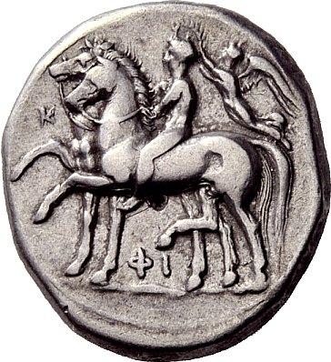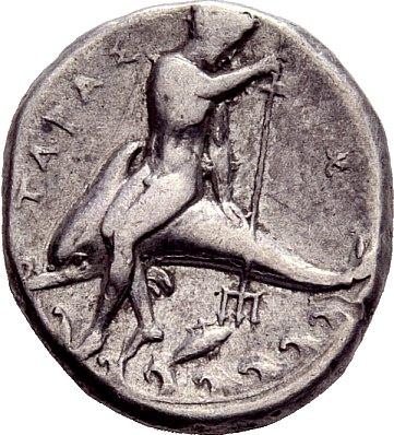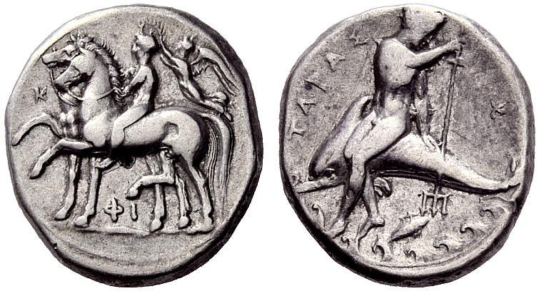 Greek Coins, Calabria, Tarentum, Nomos ca. 340-335, AR 7.73 g. Naked ephebos, crowned by Nike flying l., riding trotting horse l. and leading another beside it in the background. Rev. Dolphin rider l., bending back to strike fish below dolphin; beneath, waves. Vlasto 402 (these dies). Fischer-Bossert 708. Historia Numorum Italy 872. Rare. Toned, attempt at piercing below horse on obverse, otherwise very fine