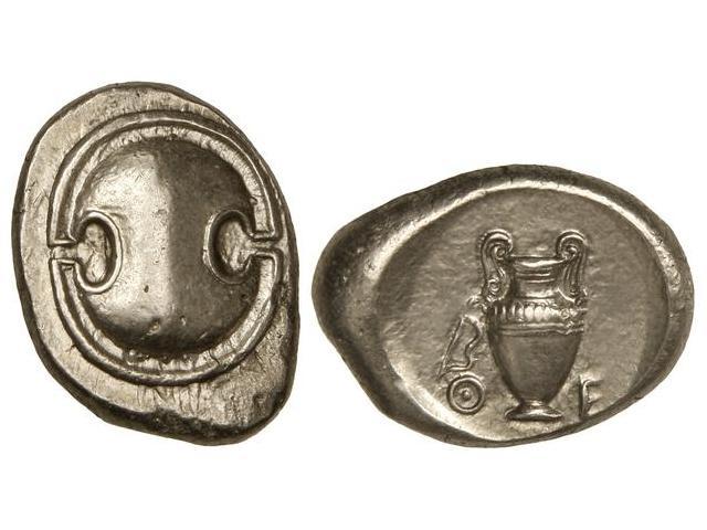 Greek Coins - Estátera. 395-387 a.C. BEOCIA. Anv.: Escudo beocio. Rev.: Ánfora, a los lados -E, a izquierda arco, todo dentro de cuadro incuso. 12,40 grs. AR. MAGNÍFICO EJEMPLAR. Se-2389. SC.