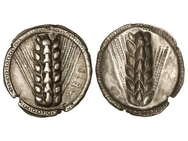 Greek Coins - Estátera. 530-510 a.C. METAPONTION. Anv.: Espiga, a derecha META. Rev.: Espiga incusa. 8,10 grs. AR. (Dos muescas de acuñación en canto). MUY ESCASA. Se-235. EBC.