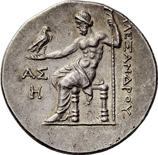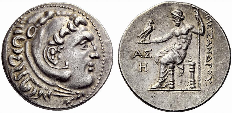 Greek Coins, Kingdom of Macedonia, Alexander III, 336 – 323 and posthumous issues, Tetradrachm, Aspendus ca. 212-182, AR 17.17 g. Head of Heracles r., wearing lion’s skin. Rev. Zeus seated l. on throne, holding eagle and sceptre. Price 2888. Lightly toned and extremely fine