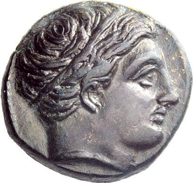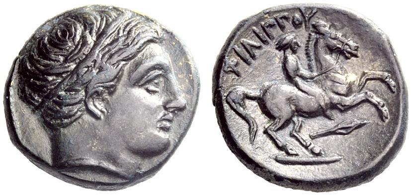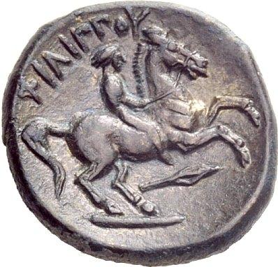 Greek Coins, Kingdom of Macedonia, Philip II 359 – 336 and posthumous issues, Unit, uncertain mint in Macedonia ca. 359-336, Æ 5.80 g. Laureate head of Apollo r. Rev. Young rider, wearing petasus, on prancing horse r.; below, spearhead. SNG ANS 850. Dark brown-green patina and extremely fine