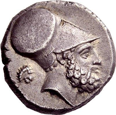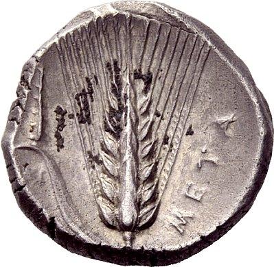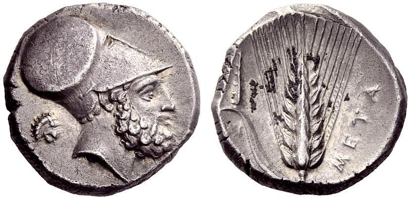 Greek Coins, Metapontum, Nomos ca. 340-330, AR 7.81 g. Head of Leucippus r., wearing Corinthian helmet; behind, lion’s head r. Rev. Ear of barley with leaf to l.; above, club. Johnston B 2.9. Historia Numorum Italy 1575. Toned and about extremely fine