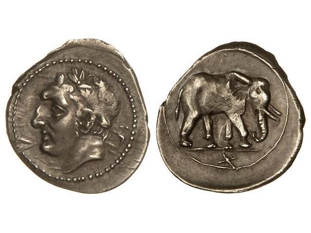 Greek Coins - Shequel. 209 a.C. CARTAGO. Anv.: Cabeza laureada a izquierda. Rev.: Elefante andando a derecha. En exergo: letra púnica alef. AR. Seaby atribuye esta acuñación a los Barcidas en España, concretamente a la ciudad de Gades. Pátina oscura. (Acuñación algo floja en parte). RARA. Se-6576. EBC-.