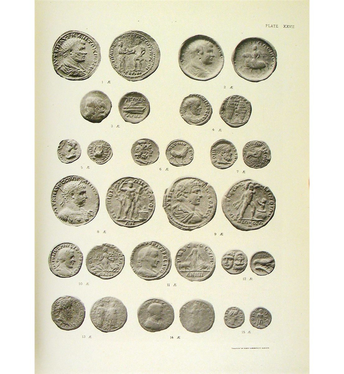 Macdonald, George. CATALOGUE OF GREEK COINS IN THE HUNTERIAN COLLECTION, UNIVERSITY OF GLASGOW. VOLUME I: ITALY, SICILY, MACEDON, THRACE, AND THESSALY. VOLUME II: NORTH WESTERN GREECE, CENTRAL GREECE, SOUTHERN GREECE, AND ASIA MINOR. VOLUME III: FURTHER ASIA, NORTHERN AFRICA, WESTERN EUROPE. First edition. Glasgow, 1899-1905. Three volumes complete. Thick 4to, original matching brown cloth, gilt; top page edges gilt; jackets present on first and second volumes. (6), lxvi, 495, (1); (2), vi, (2), 649, (1); (4), vi, (2), 799, (1) pages; tables; 102 fine plates of coins. Jackets worn; hinges a bit weak. Very good to near fine. A classic, still important work. Clain-Stefanelli 1901*. Daehn 1899: "Publishes over 12,000 coins." Grierson 57. Kroh 10.