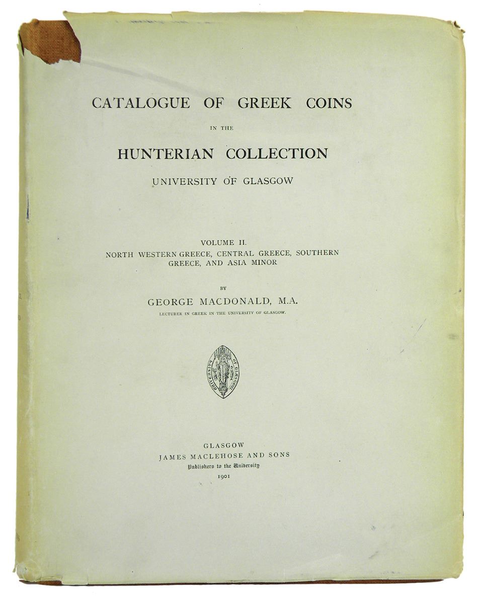 Macdonald, George. CATALOGUE OF GREEK COINS IN THE HUNTERIAN COLLECTION, UNIVERSITY OF GLASGOW. VOLUME I: ITALY, SICILY, MACEDON, THRACE, AND THESSALY. VOLUME II: NORTH WESTERN GREECE, CENTRAL GREECE, SOUTHERN GREECE, AND ASIA MINOR. VOLUME III: FURTHER ASIA, NORTHERN AFRICA, WESTERN EUROPE. First edition. Glasgow, 1899-1905. Three volumes, complete. Thick 4to, original matching brown cloth, gilt; top page edges gilt; jackets present on first and second volumes. (6), lxvi, 495, (1); (2), vi, (2), 649, (1); (4), vi, (2), 799, (1) pages; tables; 102 fine plates of coins. Jackets worn; hinges a bit weak, with some cracking. Near fine, for the most part. A classic, still important work. See catalogue for full description.