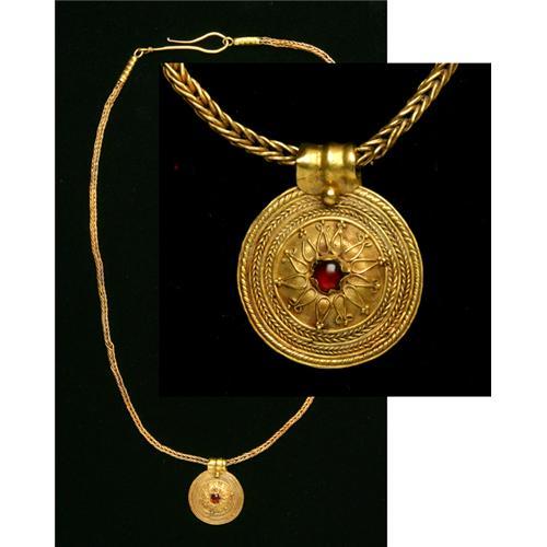 <Our item number 141269><B>Greece. Hellenistic Gold Necklace with Pendant.</B> Circa late 4th-3rd Centuries B.C. A loop-in-loop chain beautifully displays the disk pendant with a cabochon garnet centrally set within a shield-like convexity. A similar necklace can be found and described in <I>Catalogue of the Jewellery, Greek, Etuscan, and Roman, in the Departments of Antiquities, British Museum</I>, by Marshall, #2062. 18 1/4 in (46.4 cm. in length). Weight: 15.1 grams. <BR>Estimated Value $14,000 - 16,000. <I><BR>Ex Christie's 9 Dec. 2004 sale, lot 119 (realized $14,340). Before, purchased before 1988.</I> <BR><BR>Our item number 141269<BR><IMAGES><P ALIGN="CENTER"><IMG SRC="http://www.goldbergcoins.net/liveauction/49jpegs/141269.jpg"> </P></IMAGES>