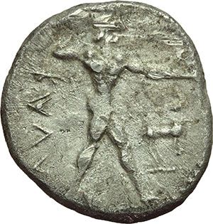 Greek. Italy. Bruttium, Kaulonia. Nomos, 475-388 BC. Obv.: Apollo advancing right, holding branch.