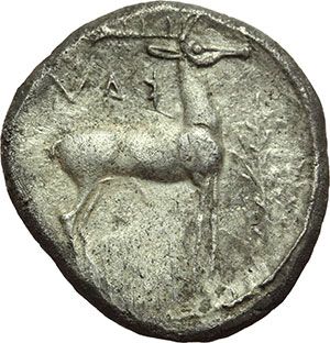 Greek. Italy. Bruttium, Kaulonia. Nomos, 475-388 BC. Obv.: Apollo advancing right, holding branch. Daimon running on Apollo's left arm. Stag standing to right. Rev.: Stag standing right. Branch to right. SNG ANS 175. AG. g. 7.78 mm. 21.50 R. Nicks on Obv., otherwise About EF/EF. A very fine example for this issue. Mondo Greco. Italia Greca. Bruttium, Caulonia. Nomos, 475-388 a.C. D/ KAV? retrogrado. Apollo che avanza a destra tiene un ramo nella mano destra alzata. Un daimon corre sul suo braccio sinistro disteso. A destra, cervo retrospiciente. R/ KAV? retrogrado. Cervo stante a destra. Nel campo a destra, un ramo. SNG ANS 175. AG. g. 7.78 mm. 21.50 R. Colpetti al D/, altrimenti qSPL/SPL. Di qualità eccellente per il tipo e di straordinaria freschezza. Un R/ di stile e conservazione eccezionali.