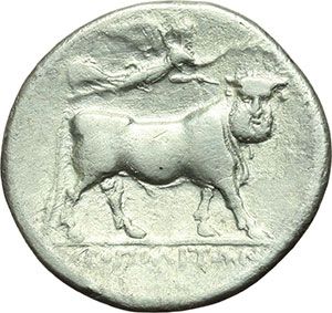 Greek. Italy. Campania, Neapolis. Didrachm, 325-241. Obv.: Head of nymph left. Statue to right. Rev.: Man-headed bull advancing right, head facing. Above, Nike flying right, crowning him. In exergue: NEO????TO?. SNG ANS 387. AG. g. 6.97 mm. 23.00 A very attractive coin. Fine style. Well centred on exceptionally large flan. Good VF+. Mondo Greco. Italia Greca. Campania, Neapolis. Didracma, 325-241. D/ Testa di ninfa a sinistra. A destra, statua. R/ Toro androcefalo che cammina a destra, con il volto di fronte. Sopra, Nike vola a destra e lo incorona. In esergo: NEO????TO?. SNG ANS 387. AG. g. 6.97 mm. 23.00 Un esemplare molto attraente, di grande stile, perfettamente centrato su flan eccezionale. Bel BB+.