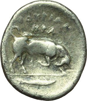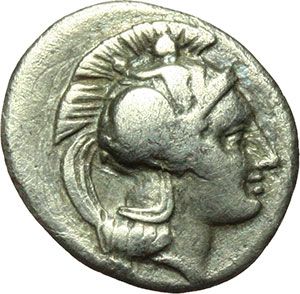Greek. Italy. Lucania, Thourioi. Triobol, circa 350-300 BC. Obv.: Helmeted head of Athena right. Rev.: TOYPION/HPA. Bull butting right. In exergue, fish. HN(Italy) 1866 SNG ANS-. AG. g. 0.98 mm. 11.50 R. VF. Mondo Greco. Italia Greca. Lucania, Thurium. Triobolo, ca. 350-300 a.C. D/ Testa elmata di Athena a destra. R/ TOYPION/HPA. Toro cozzante a destra. In esergo: pesce. HN(Italy) 1866 SNG ANS-. AG. g. 0.98 mm. 11.50 R. BB.