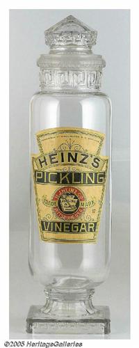 <B>Greek Key Large Heinz Display Jar</B></I> One of the finest jars we've ever had the privilege of selling. The Greek key motif continues from its base to the neck and even on the original lid to the top of this 24 1/2" tall jar. The Heinz label on the front is 6 1/4" wide by 9" and has a couple of minor flakes along the edges. One small dig appears in the center of the label but this massive sized jar simply overpowers any small defect. We can find no chips or problems with the jar or the original lid which is ground, with the jar being ground on the inside of the neck. A gorgeous display piece in its own right even without any consideration of the Heinz label. A piece of this quality and near mint appearance does not become available often. Lot:252