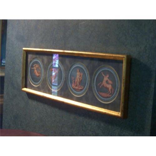 This beautiful group of Greek art is placed in one single gilded frame with a suede matte. These mythological prints are shown individually on this same site and can be purchased unframed. This frame measures 7 x 20 and has four openings for the lovely blue and old gold prints. This frame and prints are in like new condition and was purchased in an auction of prints from the 70's. The prints are lithographs which were printed the old fashioned way sometime in the 60's. There is a non glare glass installed over the prints and matting. <p>