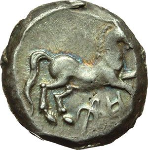 Greek. Punic Sicily. Quarter Shekel, circa 213-211 BC. Akragas(;). Obv.: Head of Triptolemus right. Rev.: Horse advancing right. (HP) Punic letters below. SNG Cop. 379. Burnett, Henna hoard, 114. AG. g. 1.76 mm. 14.00 R. EF. Beautiful old cabinet tone. Ex Nomisma 104, lot 72. Mondo Greco. Sicilia Punica. Sicilia punica, zecca incerta (Akragas?). Quarto di shekel, ca. 213-211 a.C. Akragas(;). D/ Testa di Triptolemus a destra. R/ Cavallo che galoppa a destra. Sotto, due lettere puniche (HP). SNG Cop. 379. Burnett, Henna hoard, 114. AG. g. 1.76 mm. 14.00 R. SPL. Bellissima patina di monetiere dai riflessi iridescenti. Ex Nomisma 104,72.