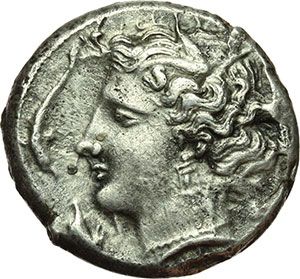Greek. Punic Sicily. Tetradrachm, 350-325 B.C. Lilybaeum (?). Obv.: Head of Tanit left. Four dolphins around. Rev.: Head of horse left. Palm tree behind. Cfr. SNG Cop. 978. AG. g. 16.85 R. About EF. Mondo Greco. Sicilia Punica. Tetradracma, 350-325 a.C. Lilybaeum (?). D/ Testa di Tanit a sinistra. Intorno, quattro delfini. R/ Testa di cavallo a sinistra. Dietro, albero di palma. Cfr. SNG Cop. 978. AG. g. 16.85 R. qSPL.