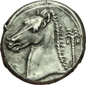 Greek. Punic Sicily. Tetradrachm, 350-325 B.C. Lilybaeum (?). Obv.: Head of Tanit left. Four dolphins around. Rev.: Head of horse left. Palm tree behind. Cfr. SNG Cop. 978. AG. g. 16.85 R. About EF. Mondo Greco. Sicilia Punica. Tetradracma, 350-325 a.C. Lilybaeum (?). D/ Testa di Tanit a sinistra. Intorno, quattro delfini. R/ Testa di cavallo a sinistra. Dietro, albero di palma. Cfr. SNG Cop. 978. AG. g. 16.85 R. qSPL.