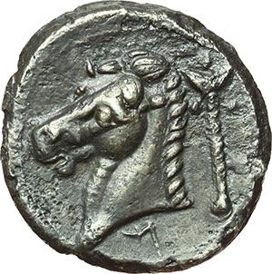 Greek. Punic Sicily. Tetradrachm, circa 320-300 BC. Obv.: Head of Persefone left. Four dolphins around. Rev.: Head of horse left. Palm tree behind. Punic letter M below. Cfr. Jenkins, SNR 56, 244. AG. g. 15.90 mm. 25.00 Good VF+/About EF. Beautiful grey old cabinet tone. Mondo Greco. Sicilia Punica. Tetradracma, ca. 320-300 a.C. D/ Testa di Persefone a sinistra. Intorno, quattro delfini. R/ Testa di cavallo a sinistra. Dietro, albero di palma. Sotto, lettera punica M. Cfr. Jenkins, SNR 56, 244. AG. g. 15.90 mm. 25.00 Bel BB+/qSPL. Bella patina grigia di monetiere.