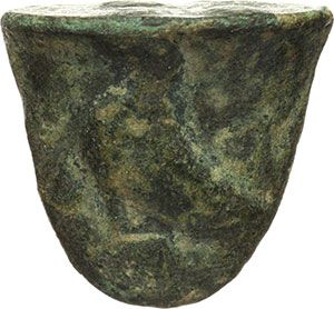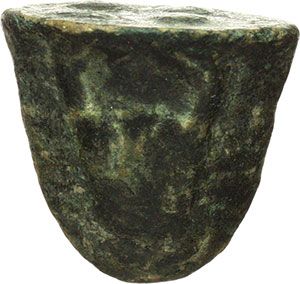 Greek. Sicily. Cast tetras, circa 450-430 a.C. Obv.: Eagle standing left, AK / Crab. Rev.: Four pellets. TV 302. AE. g. 14.40 RR. Height: 18 mm. VF. Very rare variety. Mondo Greco. Sicilia. Akragas. Tetras fuso, di forma conica a sezione ovale. Ca. 450-430 a.C. D/ Su di un lato, aquila stante a sinistra e AK. Sull'altro, granchio. R/ Sulla base, quattro globetti. TV 302. AE. g. 14.40 RR. Altezza: 18mm. BB. Variante molto rara.