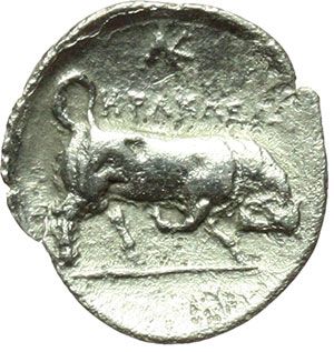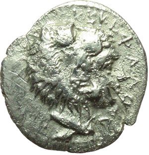 Greek. Sicily. Cephaloedium. Litra, 307-305 B.C. Obv.: EK KEFA?OI?[ ]. Head of Herakles right. Rev.: Bull butting right. Monogram AK above and legend HPAK?EI[ ]. Cfr. Jenkins 3. Campana 3. AG. g. 0.40 mm. 12.00 RRR. VF. Very rare. Mondo Greco. Sicilia. Cephaloedium. Litra, 307-305 a.C. D/ EK KEFA?OI?[ ]. Testa imberbe di Eracle a destra, che indossa scalpo di leone. R/ Toro cozzante a destra. Sopra, monogramma AK e legenda HPAK?EI[ ]. Cfr. Jenkins 3. Campana 3. AG. g. 0.40 mm. 12.00 RRR. BB. Emessa nel breve periodo nel quale Kephaloidion ricevette il presidio greco da Agatocle. Il monogramma AK potrebbe essere in relazione proprio con il nome (A)gato(k)les. Di grande rarità.