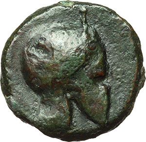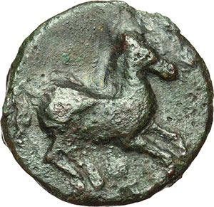 Greek. Sicily. Entella. Hexas (?), circa 345-338 BC. Obv.: Horse galloping right. Rev.: [ENTE??]. Helmet right. Calc. I, p.320,14 OS. Campana 12. AE. g. 4.74 mm. 17.00 R. VF. Rare. Probably overstruck on Siculo-Punic AE with Tanit / Horse. Mondo Greco. Sicilia. Entella. Hexas (?), ca. 345-338 a.C. D/ Cavallo libero che corre a destra. R/ [ENTE??]. Elmo con apex a destra. Calc. I, p.320,14 OS. Campana 12. AE. g. 4.74 mm. 17.00 R. BB. Raro. Probabilmente riconiato su bronzo siculo-punico Tanit/cavallo.