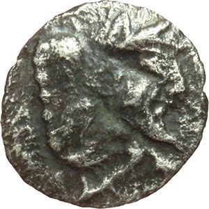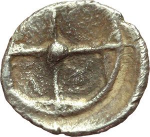 Greek. Sicily. Gela. Obol, 420-405 BC. Obv.: Forepart of man-headed bull right. Rev.: Wheel with four-spokes. SNG Cop. 259. AG. g. 0.57 mm. 9.00 R. VF. Mondo Greco. Sicilia. Gela. Obolo, 420-405 a.C. D/ Protome di toro androcefalo che nuota a destra. R/ Ruota a quattro raggi. SNG Cop. 259. AG. g. 0.57 mm. 9.00 R. BB.