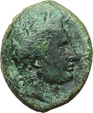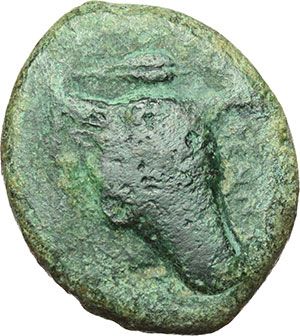 Greek. Sicily. Henna. Hemilitron, circa 343-339 BC. Obv.: Head of Demeter right, wearing barley wreath. Rev.: Bull's head right. Barley-grain above. Calc. III, p.232,3. Campana 4. AE. g. 11.85 mm. 24.00 RR. VF/About VF. Very rare. Mondo Greco. Sicilia. Henna. Emilitra, ca. 343-339 a.C. D/ Testa di Demetra a destra, coronata di spighe. A destra, tracce di legenda ?AMAT. R/ Testa di bue a destra, ornata con nastri sacrificali. Sopra, chicco d'orzo. A destra, etnico ENNAIO?. Calc. III, p.232,3. Campana 4. AE. g. 11.85 mm. 24.00 RR. BB/qBB. Molto rara.