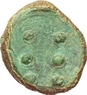Greek. Sicily. Himera. Hemilitron, after 430 BC. Obv.: Gorgoneion with protruding tongue. Rev.: Six pellets. Calc. 24. SNG ANS 180. AE. g. 13.65 About EF/EF. Beautiful emerald green patina. Mondo Greco. Sicilia. Himera. Emilitra, dopo il 430 a.C. D/ Testa frontale di Gorgone con lingua protrusa. R/ Sei globetti. Calc. 24. SNG ANS 180. AE. g. 13.65 qSPL/SPL. Un esemplare di grande freschezza, con incantevole patina verde smeraldo.