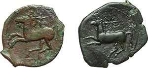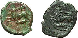 Greek. Sicily. Kainon. AE 25-23mm. Lot of 2 specimens, circa 340 BC. Obv.: Griffin springing left. Locust below. Rev.: Horse prancing left. Star above. Cfr. SNG ANS 1175. AE. R. g.8.44; g.582. VF. Mondo Greco. Sicilia. Kainon. AE 25-23mm. Lotto di 2 esemplari, ca. 340 a.C. D/ Grifone che corre a sinistra. Sotto, locusta. R/ Cavallo a briglie sciolte che scalpita a sinistra. Sopra, stella. In esergo, tracce di etnico KAINON. Cfr. SNG ANS 1175. AE. R. g.8.44; g.582. BB.