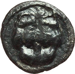 Greek. Sicily. Leontini. Litra, 475-466 BC. Obv.: Facing lion's scalp. Rev.: ?EON. Barley grain. SNG ANS 213. AG. g. 0.70 mm. 9.00 R. Rare. Beautiful dark patina. About EF/EF. Mondo Greco. Sicilia. Leontini. Litra, 475-466 a.C. D/ Testa di leone di fronte. R/ ?EON. Chicco d'orzo. SNG ANS 213. AG. g. 0.70 mm. 9.00 R. Rara. Bellissima patina scura. qSPL/SPL.