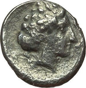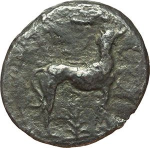Greek. Sicily. Motya. Didrachm, 415-410 BC. Obv.: Dog standing right. Grain below. Rev.: Head of nymph right. BMC 2,4. SNG ANS-. Campana 6 B/b. AG. g. 7.32 mm. 21.00 RRR. Corrosions, otherwise VF. Very rare. Mondo Greco. Sicilia. Motya. Didracma, 415-410 a.C. D/ Cane stante a destra. Sotto, pianta di grano. R/ Testa di ninfa a destra. Davanti, tracce di etnico MOTVAION. BMC 2,4. SNG ANS-. Campana 6 B/b. AG. g. 7.32 mm. 21.00 RRR. Corrosioni, altrimenti BB. Di grande rarità. Cinque esemplari censiti da Campana, di cui quattro in raccolte pubbliche.