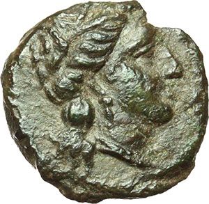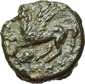 Greek. Sicily. Nakona. Hemilitron (?), circa 307-305 BC. Obv.: Head of Demeter-Persephone right, wearing barley wreath, necklace and earring. Rev.: NAKONAIO?. Pegasos flying. Campanian helmet below. Calc. I, p.325, n. 4. Cfr. Campana 7 (**). AE. g. 3.35 mm. 15.00 RR. VF. Very rare. Mondo Greco. Sicilia. Nakona. Emilitra (?), ca. 307-305 a.C. D/ Testa di Demetra-Persefone a destra con corona di spighe, collana e orecchini. A destra, tracce di legenda KAM?ANON. R/ NAKONAIO?. Pegaso che vola a sinistra. Sotto, elmo campano. Calc. I, p.325, n. 4. Cfr. Campana 7 (**). AE. g. 3.35 mm. 15.00 RR. BB. Molto rara: un solo esemplare di peso ridotto censito da Campana.