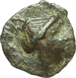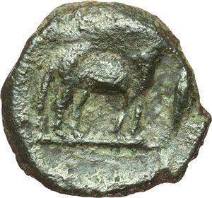 Greek. Sicily. Nakona. Hexas (?), circa 330-310 BC. Obv.: Female head right. Rev.: Sheep standing right. Leaf and barley grain before. Calc. I, p.326, n. 5-6. Campana 5. AE. g. 1.55 mm. 12.50 RR. VF. Very rare. Only four specimens registered from Campana. Mondo Greco. Sicilia. Nakona. Hexas (?), ca. 330-310 a.C. D/ Testa femminile a destra. R/ Pecora stante a destra su linea d'esergo. Davanti, foglia o chicco d'orzo. Calc. I, p.326, n. 5-6. Campana 5. AE. g. 1.55 mm. 12.50 RR. BB. Molto raro. Quattro soli esemplari censiti da Campana.