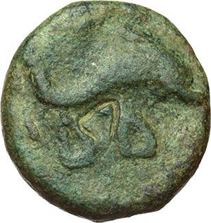 Greek. Sicily. Segesta. C. Iunius C. f. Longus II vir. AE 20mm. Obv.: C. IVLIVS C F LONGVS II VIR. Two pilei. Rev.: Dolphin right. [EX] above. DD below. RPC 649. AE. g. 8.08 RR. Good VF+. Very rare. Mondo Greco. Sicilia. Segesta. C. Iunius C. f. Longus II vir. AE 20mm. Periodo triumvirale?. D/ C. IVLIVS C F LONGVS II VIR. Due pilei sormontati da stelle. R/ Delfino a destra. Sopra, [EX]. Sotto, DD. Al centro, contromarca. RPC 649. AE. g. 8.08 RR. Bel BB+. Molto rara e interessante emissione provinciale della repubblica romana.