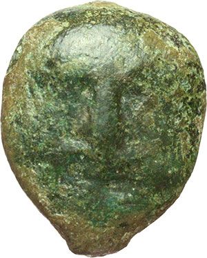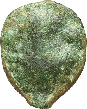 Greek. Sicily. Selinunte. Cast hexas, circa 440-425 BC. Obv.: Head of Sileno facing. Rev.: Leaf and two pellets. TV 314. AE. g. 3.43 mm. 17.00 Very rare. Mondo Greco. Sicilia. Selinunte. Hexas fuso, ca. 440-425 a.C. D/ Testa frontale di Sileno. R/ Foglia e due globetti. TV 314. AE. g. 3.43 mm. 17.00 Di peso ridotto. BB. Molto raro.