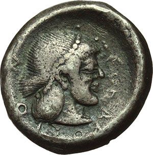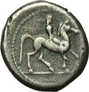 Greek. Sicily. Syracuse. Drachm, circa 484-483 BC. Obv.: Nude horseman riding right. Rev.: SVRAKOSION. Head of Arethusa right. Cfr. Boehringer 54.9. Cfr. SNG ANS 12. AG. g. 4.24 mm. 14.50 RR. VF. Very rare. Of the best archaic style. Ex Nomisma 104, lot 58. Mondo Greco. Sicilia. Siracusa. Dracma, ca. 484-483 a.C. D/ Cavaliere nudo su cavallo al passo a destra. R/ SVRAKOSION. Testa di Arethusa a destra. Cfr. Boehringer 54.9. Cfr. SNG ANS 12. AG. g. 4.24 mm. 14.50 RR. BB. Molto rara. Del migliore stile arcaico. Ex Nomisma 104,58.