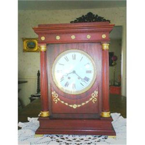 This superb Mahogany Bracket Clock is large and very impressive having the Greek Style utilizing fluted columns, flat stepped top and gold leaf embellishment to the garland, frieze, and columns. The works are French eight days going, striking the hour and half hour on a large gong and have been professionally serviced. The face is enamel showing no damage or cracks, hands are steel Breguet style. Clock back has a glazed bezel for access to the pendulum.
