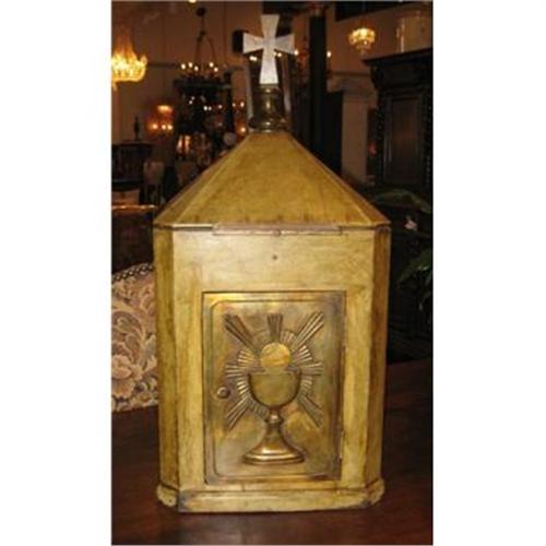 Hand carved wooden Greek tabernacle with gilded detail and silk lined interior.</em></td>