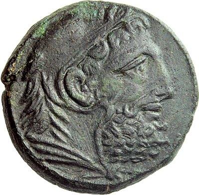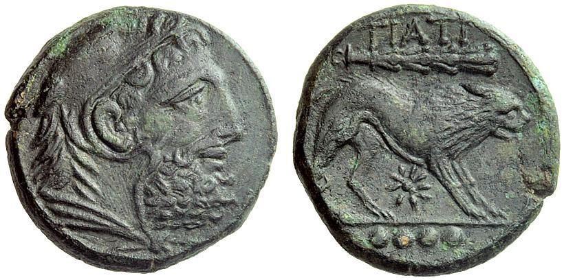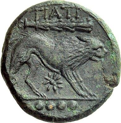 Greek coins, Apulia, Tiati, Triens ca. 217, Æ 13.43 g. Head of Heracles r., wearing lion’s skin headdress. Rev. TIATI Lion walking r.; above, club and below, star. In exergue, four pellets. SNG Copenhagen 700. SNG France 1436. Historia Numorum Italy 704. Dark green patina and extremely fine