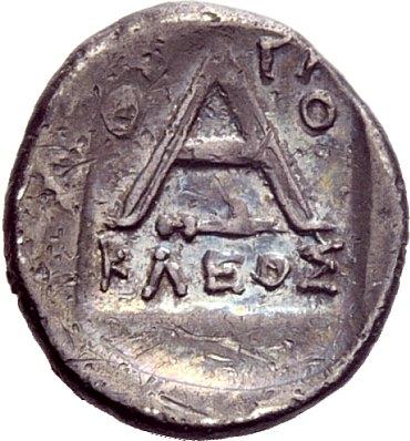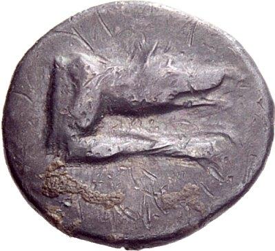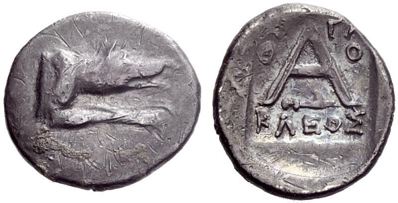 Greek coins. Argolis, Argos. Diobol ca. 80-50, AR 2.21g. Forepart of wolf r. Rev. Large A within incuse square. BMC 110. BCD Peloponnesos 1170. Toned and about very fine / good very fine. From the Goekoop collection.