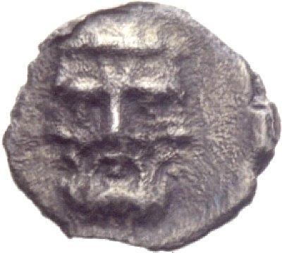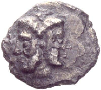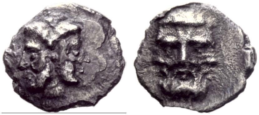 Greek coins, Asia Minor, uncertain mint, Obol ca. 350-300, AR 0.50 g. Male/female double head. Rev. Dionysiac herm with four faces, of which only three are visible. Jameson cf. 1458a (trihemiobol). M&M list 373, 1975, 90. Exceedingly rare, apparently only the second specimen known. Toned and very fine Ex M&M GmbH sale 13, 2003, 574.