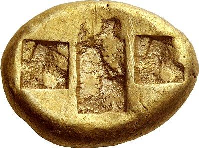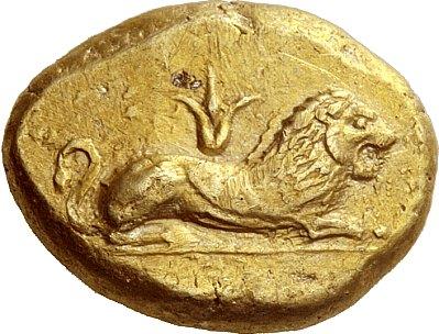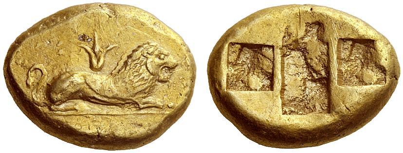 Greek coins, Asia Minor, uncertain mint, Stater ca. 500-480, EL 14.06 g. Lion lying down r.; above lotus flower. Rev. A rectangular incuse with rough surface between two square incuses with rough surface. Rosen cf. 245 (lion l.). Of the highest rarity, only the third specimen known. Well struck on a full flan with a superb representation. Extremely fine Ex Gorny & Mosch sale 164, 2008, 83. This stater is the third known example of the type. The other two are: Swiss private collection (same dies) and H. J. Berk, Buy or Bid Sale 61, 1990, 1 (different obverse die, same reverse dies). The coins were struck using two independent reverse dies for three incuse punches. First was applied the rectangular die in the centre, and then, the same square die on the left and on the right. This strike technique in three times caused the field of the obverse of being structured in three planes: one in the middle corresponding to the action of the rectangular die and one on each sides, disposed at an angle, corresponding to the subsequent action of the square die. This technique is characteristic of a small number of electrum staters associate to our coin. They bear the following types: jointed protomes of lion and bull (Weidauer 133), jointed protomes of bull and lion (Kraay-Hirmer 590 = Traité pl. 2, 3), jointed protomes of two lions with lotus flower (CNG 24, 1992, 292A), human headed winged man-faced bull (Gulbenkian 720 = Weidauer 178). The weight standard, typology and manufacture strongly suggest a Lydian or Ionian association for the series
