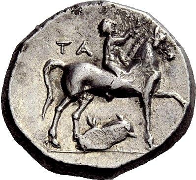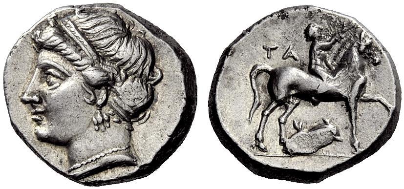 Greek coins. Calabria, Tarentum. Nomos after 276, AR 7.35g. Diademed female head l. Rev. Horseman r., crowning his horse; below, dolphin. Vlasto 1012. SNG France 1972. Historia Numorum Italy 1098. Die break on reverse, otherwise extremely fine