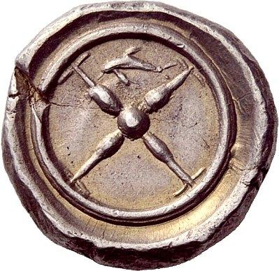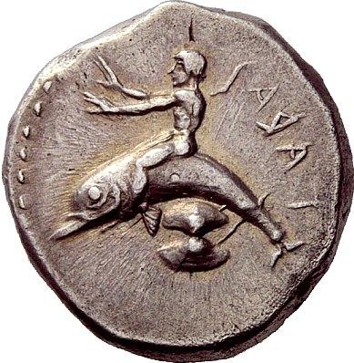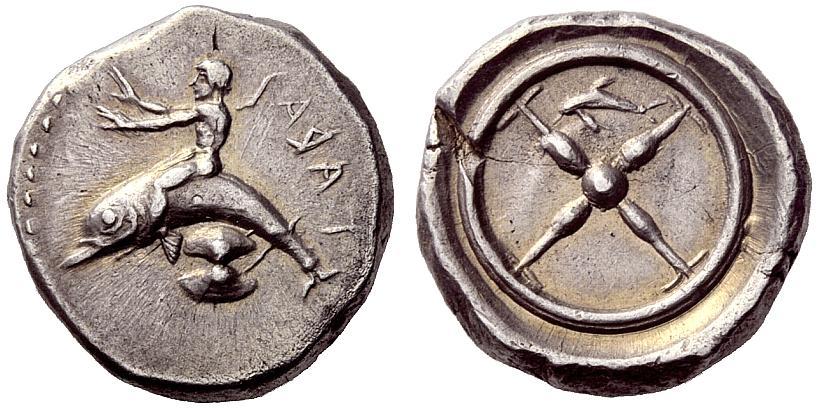 Greek coins, Calabria, Tarentum, Nomos ca. 480-470, AR 8.15 g. TARAS retrograde Dolphin rider l., with both arms outstretched; below, shell. Rev. Wheel with four spokes, within which dolphin. SNG Lloyd 111 (these dies). SNG Copenhagen 770 (these dies). Fischer-Bossert 90. Historia Numorum Italy 833. In exceptional condition for difficult issue, lightly toned good extremely fine