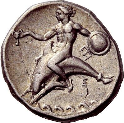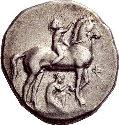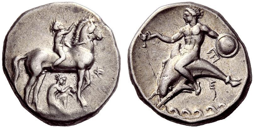 Greek coins, Calabria, Tarentum, Nomos ca. 340-325, AR 7.88 g. Horse standing r. crowned by rider and lifting l. front leg for boy kneeling to remove stone; in r. field, F. Rev. [TARAS] Dolphin rider l., holding cantharus in r. hand and shield and trident in l.; below, E. Underneath, waves. Vlasto 510 (these dies). SNG ANS 961 (these dies). SNG France 1760. Kraay-Hirmer pl. 107, 310 (this obverse die). Fischer-Bossert 695. Historia Numorum Italy 888 var. Rare. A very pleasant representation of fine style. Lightly toned, minor traces of overstriking, otherwise good very fine