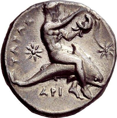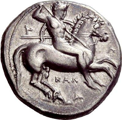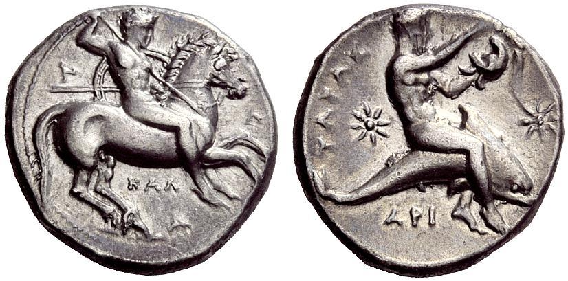 Greek coins, Calabria, Tarentum, Nomos ca. 333-330, AR 7.81 g. Horseman r., spearing downward with r. hand and holding shield and two more spears with l.; in l. field, I- and in r., L. Below horse, KAL / D. Rev. TARAS Dolphin rider r., holding crested helmet; on either side, star and below, API. Vlasto 543 (this obverse die). SNG Lloyd 1787 (these dies). SNG France 1770 (this obverse die). Kraay-Hirmer pl. 107, 311. Fischer-Bossert 771. Historia Numorum Italy 896. Lightly toned and about extremely fine