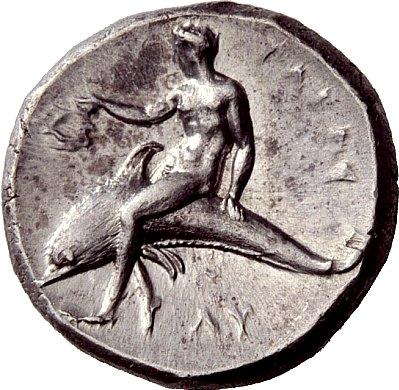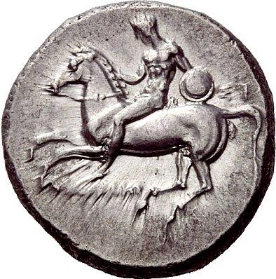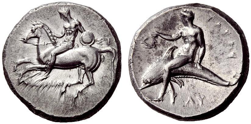 Greek coins, Calabria, Tarentum, Nomos ca. 281-270, AR 7.80 g. Horseman riding l., holding shield in l. hand; in r. field, SI. Below horse, FILOKLHS. Rev. TARAS Dolphin rider l., holding wreath in r. hand and resting l. on dolphin’s back; below, LU. Vlasto 688. SNG ANS 1063. SNG France 1878 (these dies). Historia Numorum Italy 965. Extremely fine