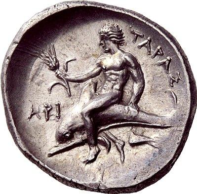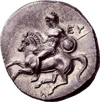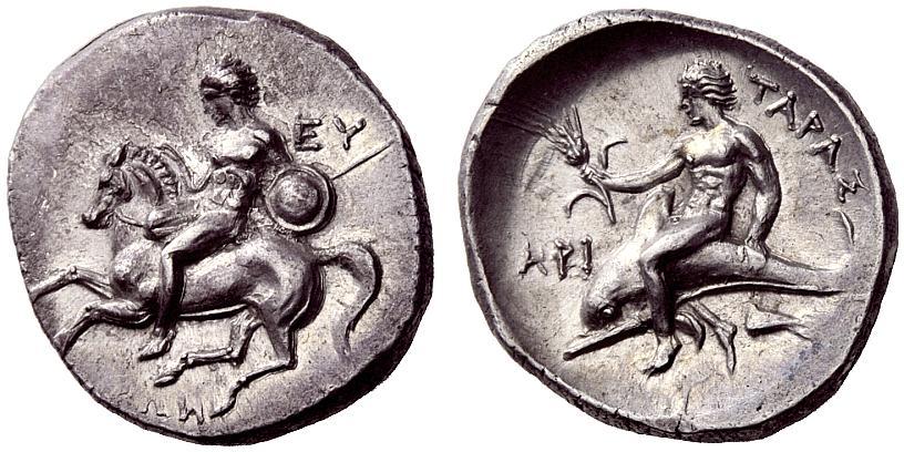Greek coins, Calabria, Tarentum, Nomos ca. 281-270, AR 7.82 g. Horseman l., holding shield and spear in l. hand, about to dismount; in r. field, EY. Below horse, NIKWN. Rev. TARAS Dolphin rider l., holding corn ear in r. hand and resting l. on dolphin’s back; in l. field, API and below, spear-head r. Vlasto 702. Jameson 165 (these dies). SNG ANS 1078. Historia Numorum Italy 969. Well struck in high relief and of masterly style. Good extremely fine