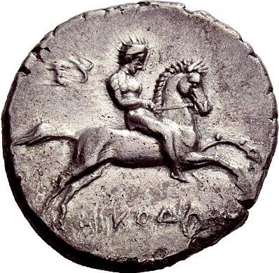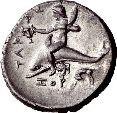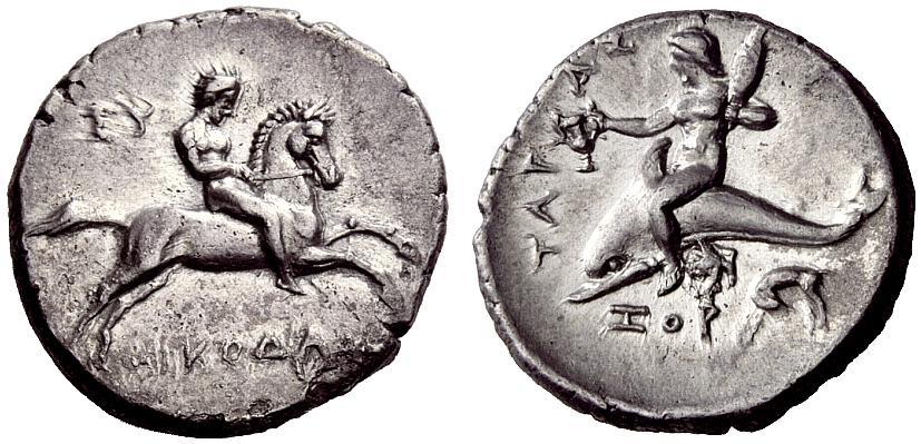 Greek coins, Calabria, Tarentum, Nomos ca. 281-270, AR 7.79 g. Horseman galloping r., holding reins with both hands; in l. field, SU. Below horse, NIKODAMOS. Rev. TA - RAS Young dolphin rider l., holding cantharus and distaff; below, IOP and gazelle. Vlasto 704. SNG München 663. SNG ANS 1079. SNG France 1886. Historia Numorum Italy -. Rare. Insignificant die-break on reverse, otherwise good extremely fine
