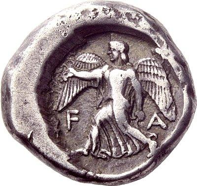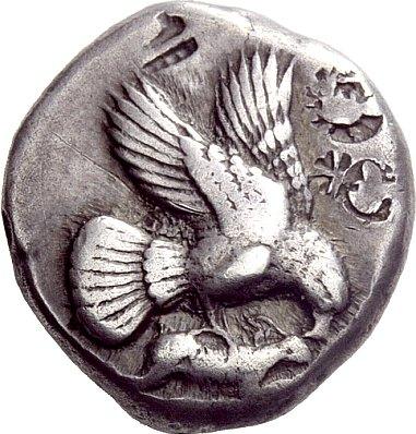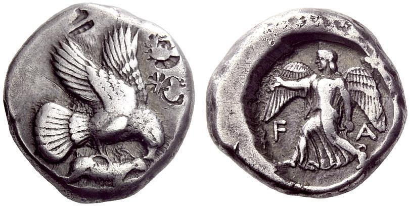 Greek coins, Elis, Stater ca. 440, AR 12.39 g. Eagle flying r., grasping hare with its talons and tearing at it with its beak. Rev. F – A Nike striding l., holding wreath in r. hand and rising hem of chiton with l. Seltman 69. SNG Spencer-Churchill 165 (this coin). BCD Olympia –. Very rare and in unusually good condition for this difficult issue. Old cabinet tone, countermarks on obverse, otherwise good very fine Ex Ars Classica XVI, 1933, Captain Spencer-Churchill, 1286 and LHS 100, 2007, 263 sales. From the Maly and Gillet collections.