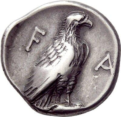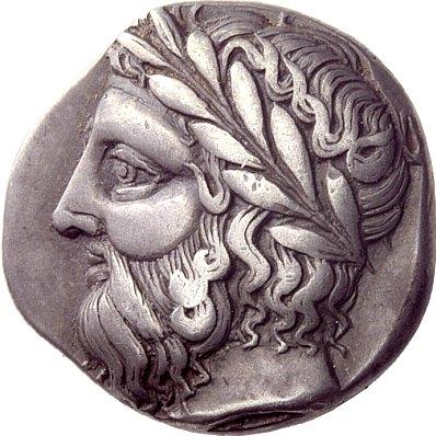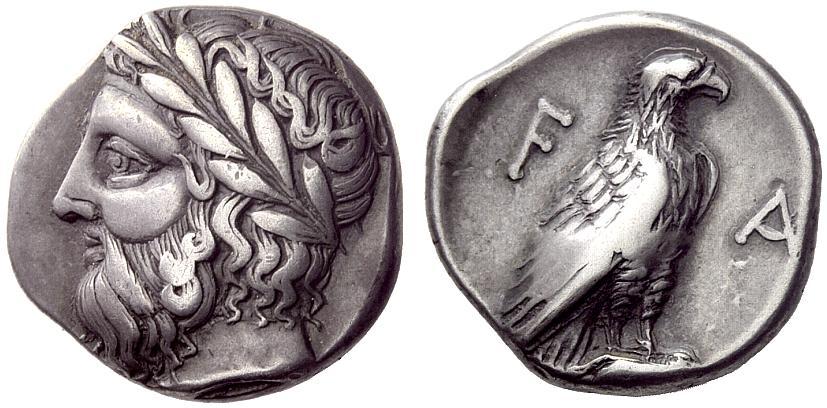 Greek coins, Elis, Stater ca. 360, 105th Olympiad, AR 12.21 g. Laureate head of Zeus l. Rev. F – A Eagle, with wings folded, standing r. on Ionic column capital. SNG Delepierre 2146 var. Seltman –, group G series XX, CC (this obverse die) and reverse unrecorded. BCD Olympia 121 (this coin). Very rare. A superb portrait of appealing style, old cabinet tone and good very fine Ex Leu sale 90, 2004, BDC, 121.